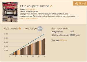 Je n’ai pas reussi à aller au bout du challenge de 50000 mots mais je reste tout de meme satisfait de moi : 39939 mots ecris en un mois, ça reste honorable et de toute maniere je vais poursuivre au dela de ce mois echu.